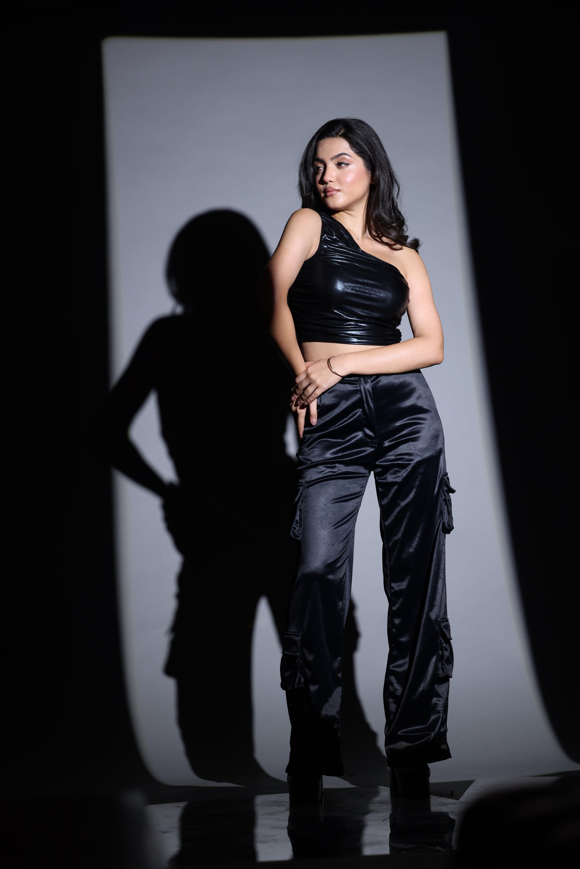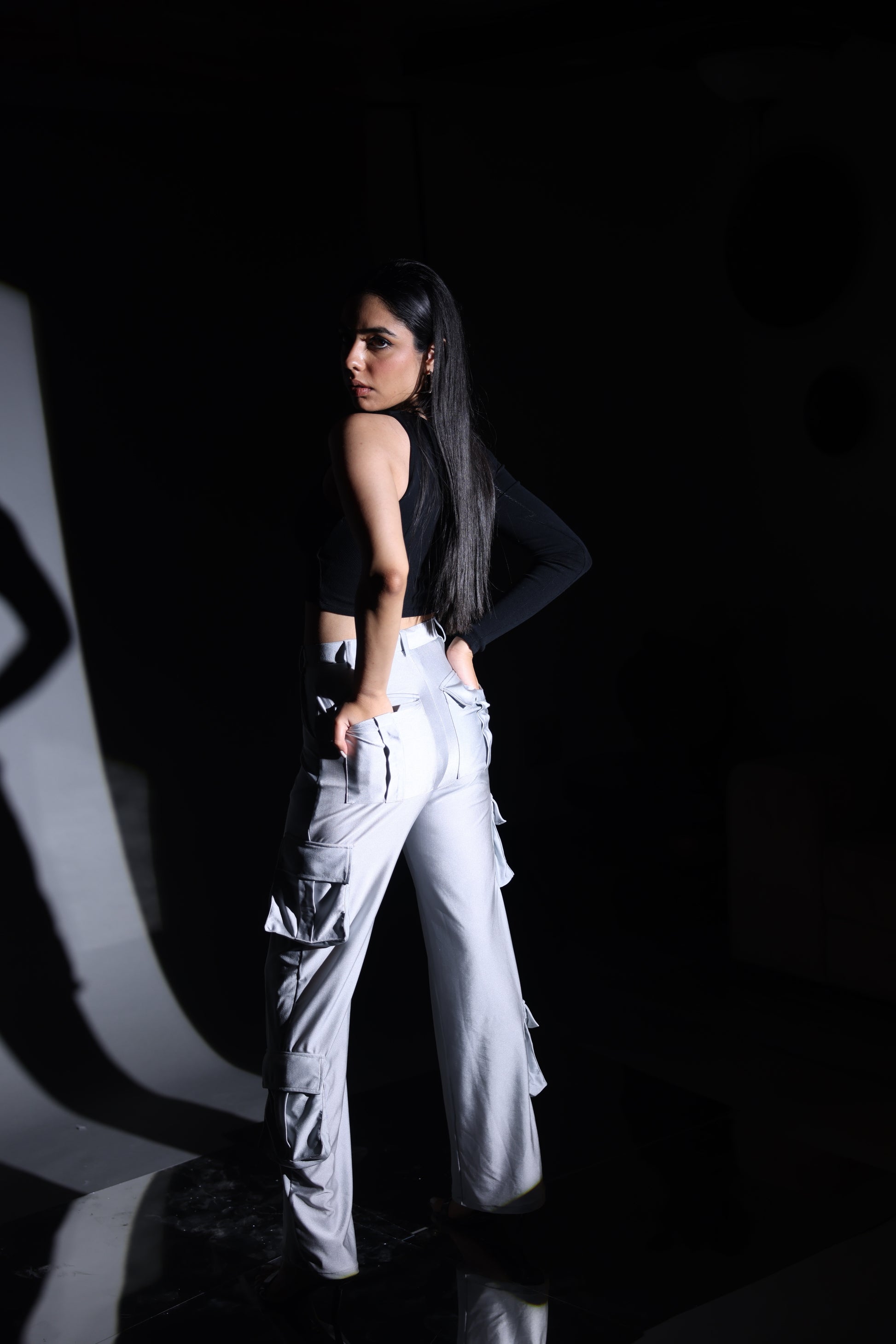 Satin finish stretchable satin cargo style pants, Same Day shipping