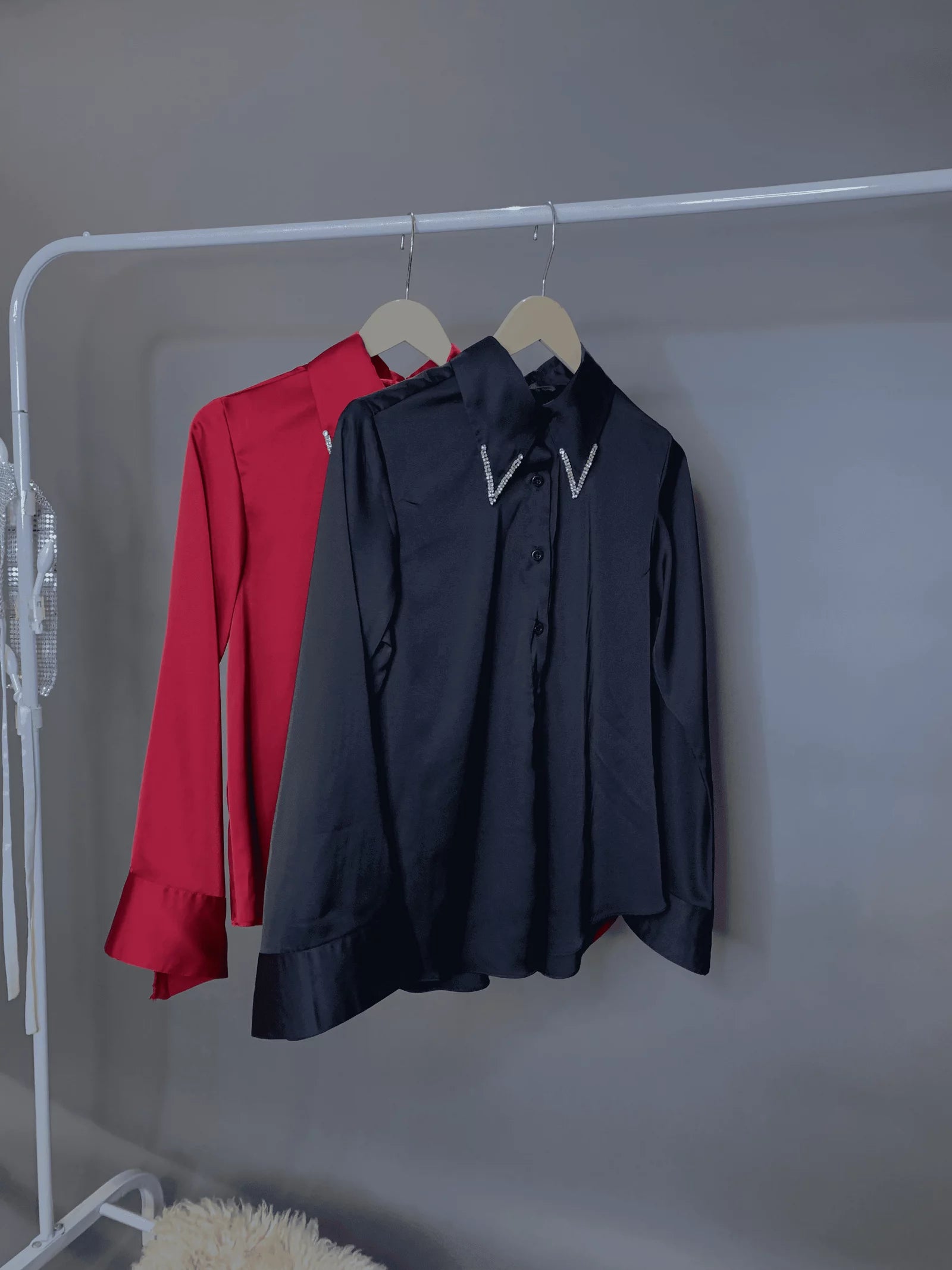 satin shirt with rhinestone on the collar and bell cuffs