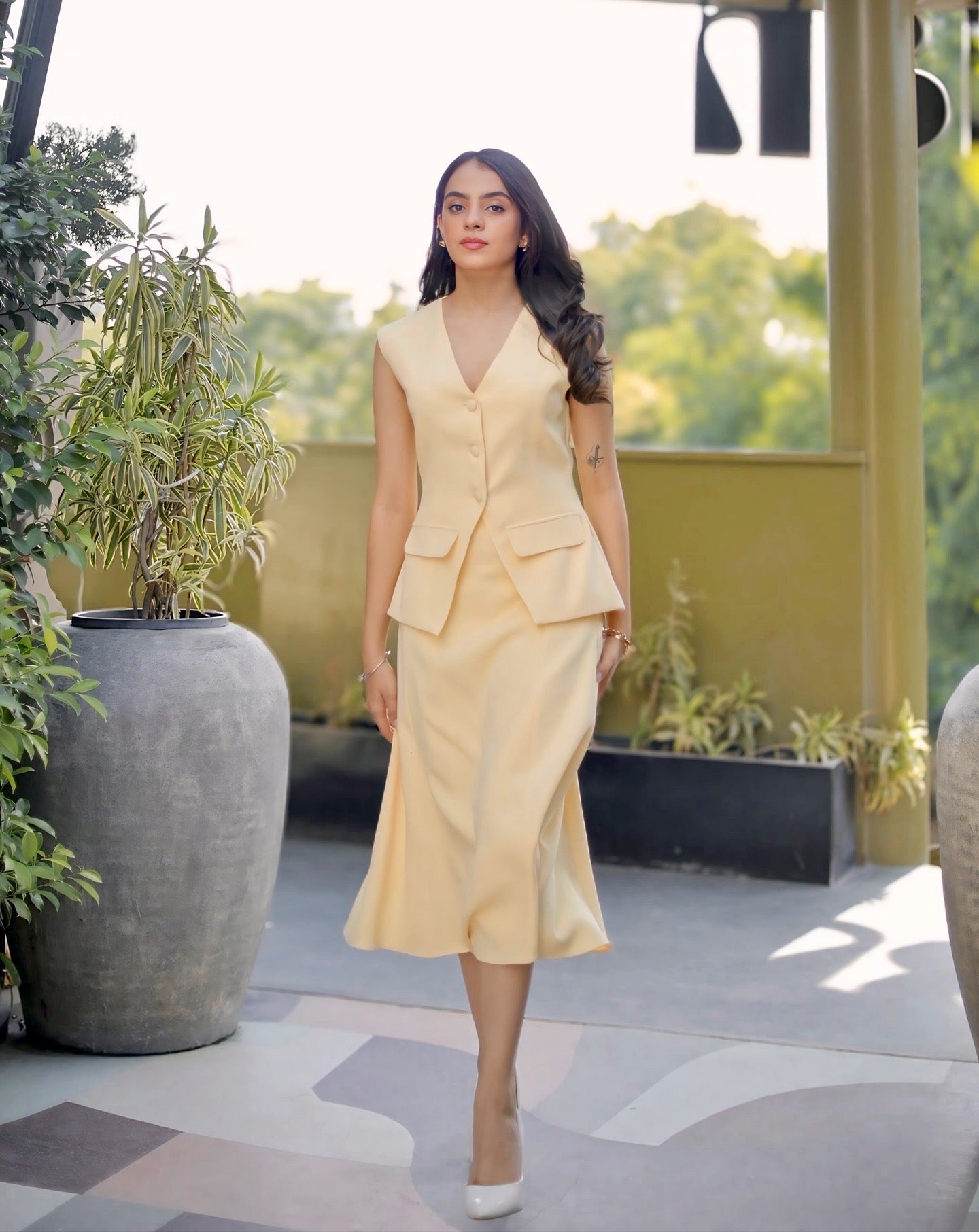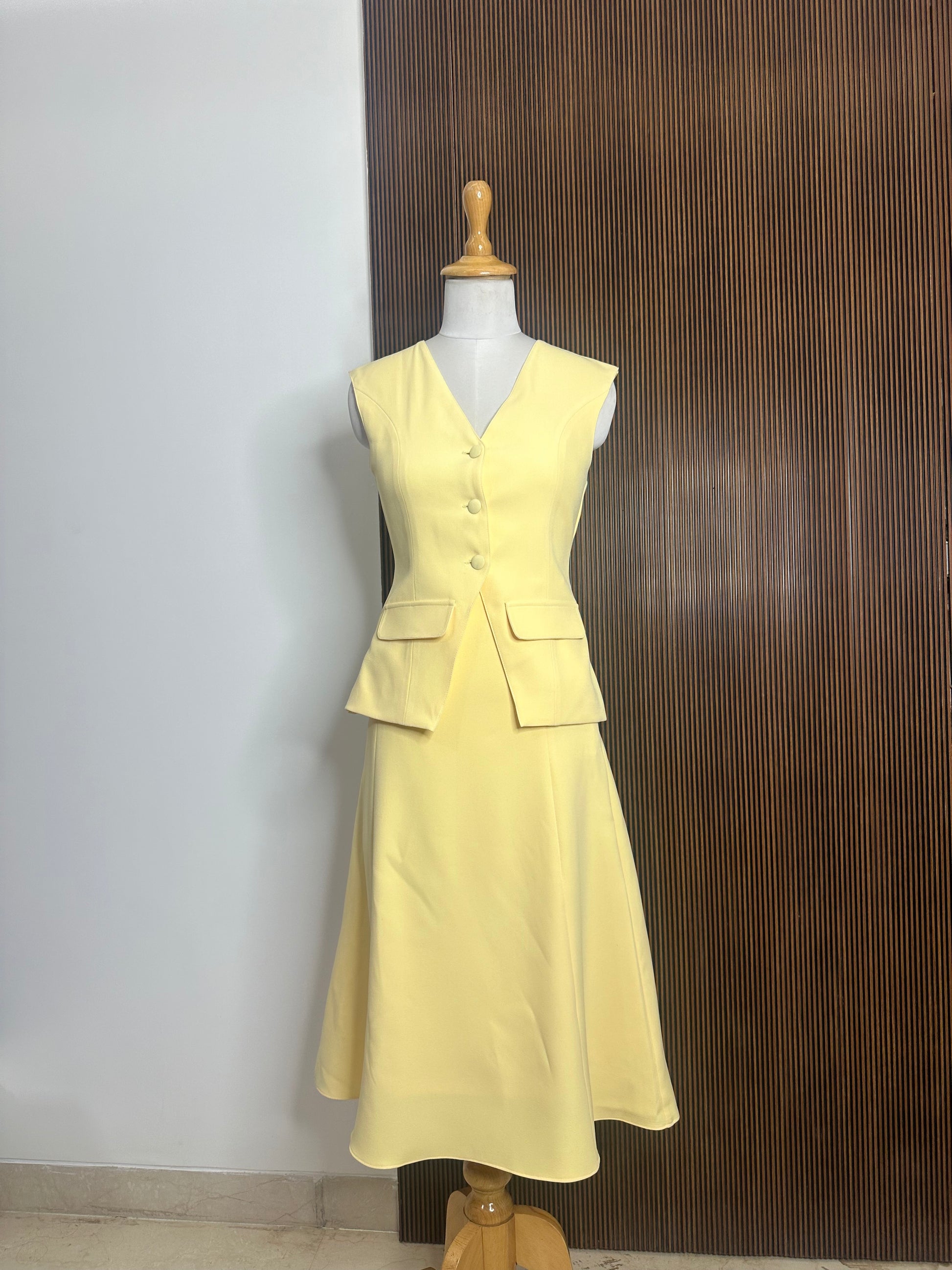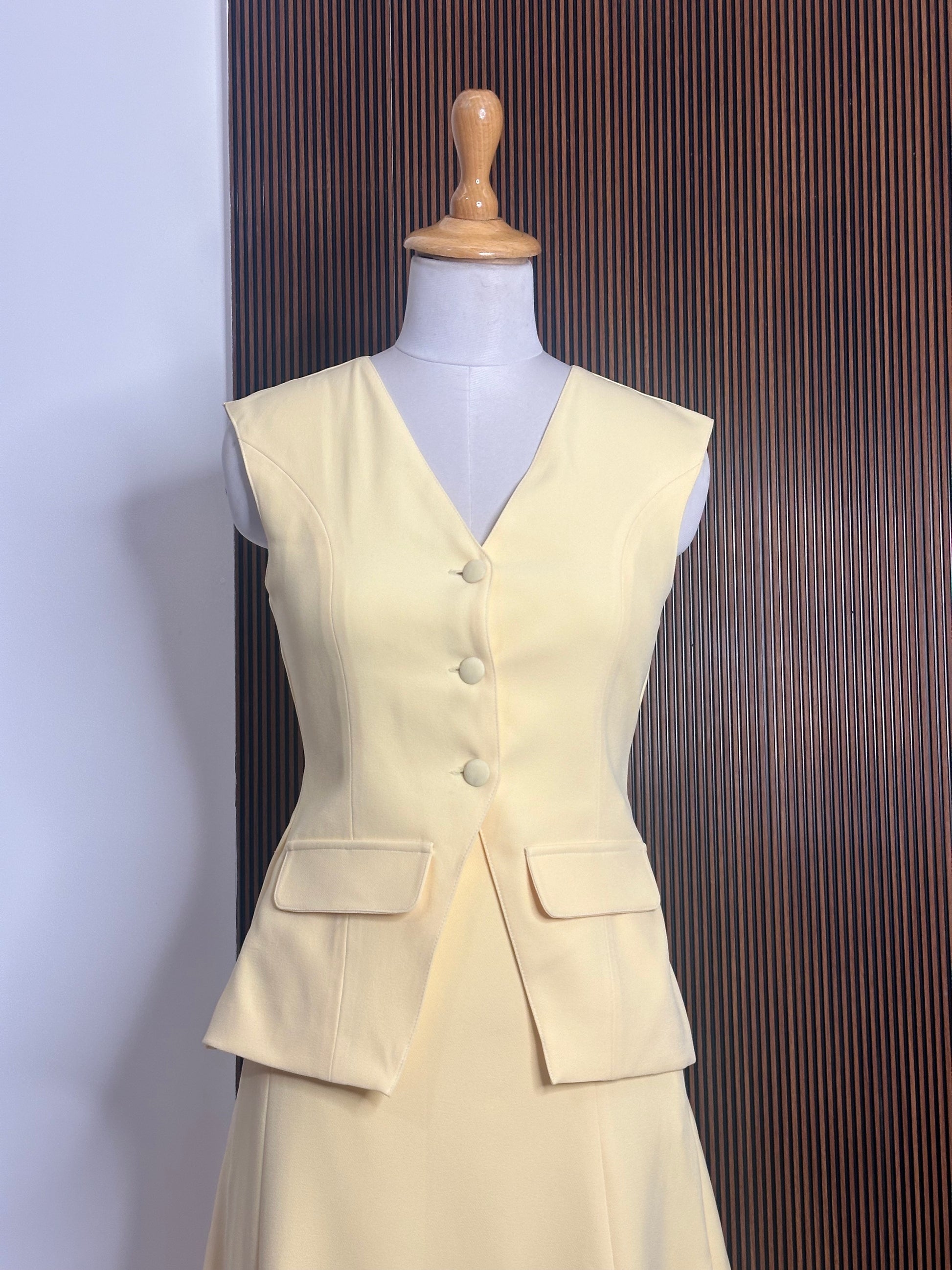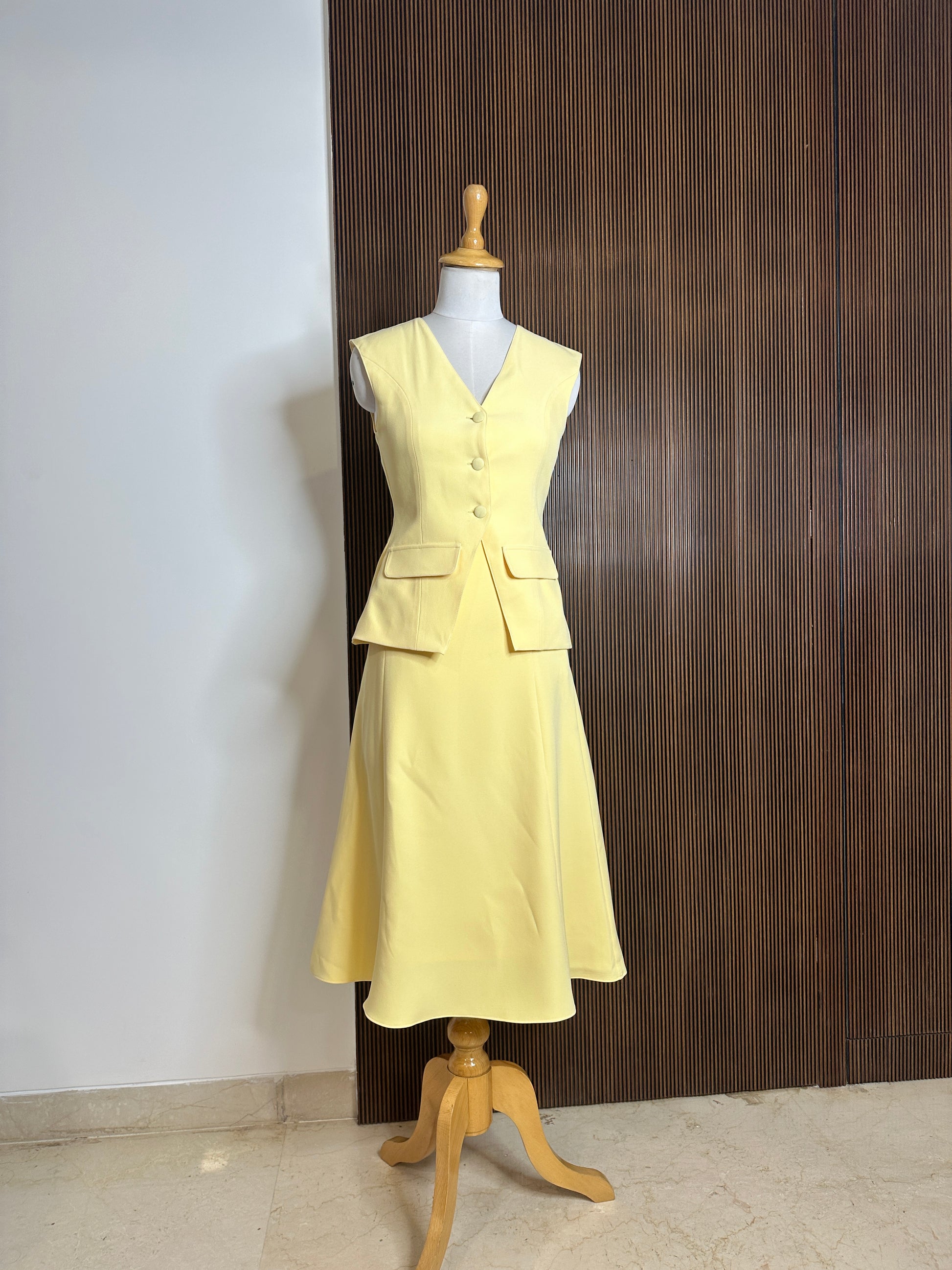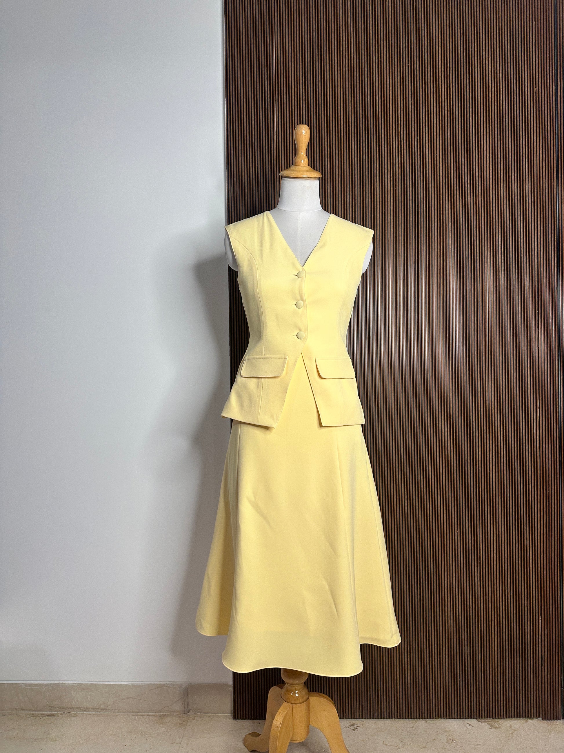 Waistcoat and midi skirt set with crepe lining and fabric buttons